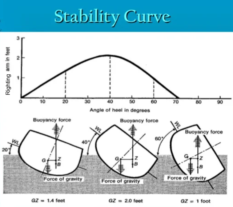 It involves a variety of calculations, including the ship’s displacement, center of buoyancy, metacentric height and stabilizing levers.