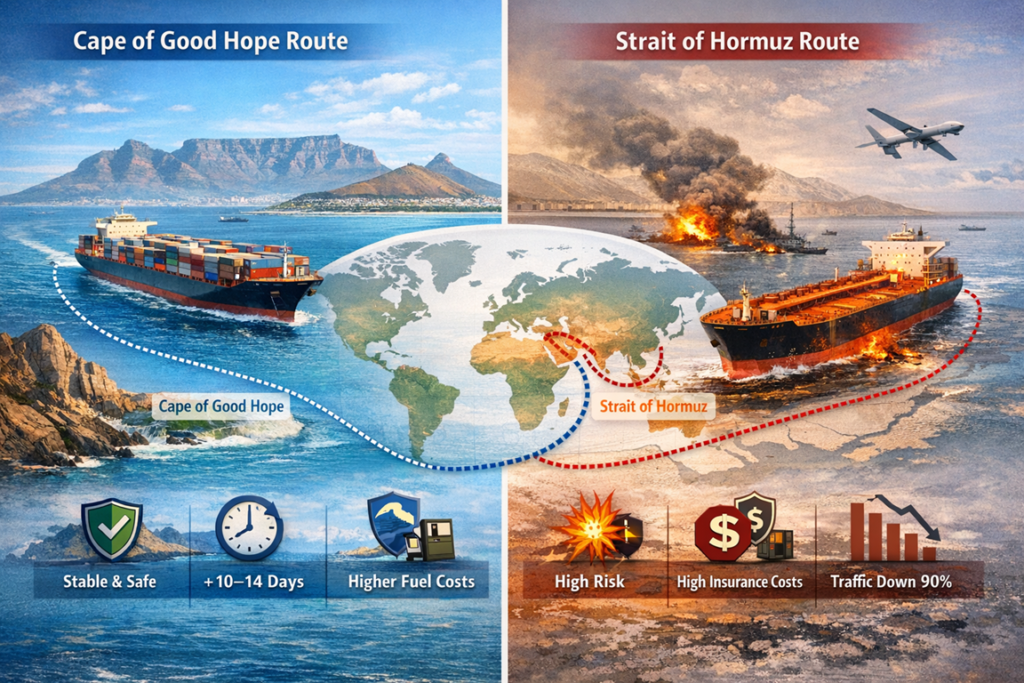 The Cape route adds 10–14 days to transit times compared to the Hormuz-Suez route, but its stability makes it preferable.