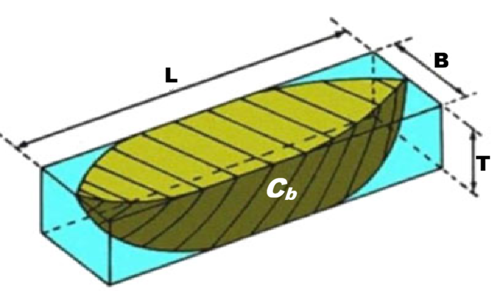 - Cb: Block coefficient (ratio of actual underwater volume to the volume of a rectangular block with same dimensions)