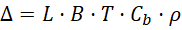 Where L = length, B = breadth, T = draft, Cb= block coefficient, and ρ = water density